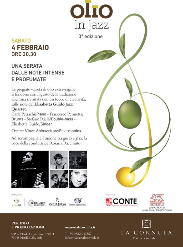 NARDO’ (Lecce) – Ogni portata, un brano musicale: ciò prenderà vita a Masseria La Cornula dove l’olio extravergine d’oliva protagonista della serata, si unirà ai sapori della tradizione sulle note del jazz.