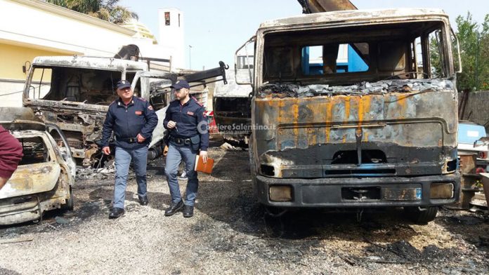 Attentato incendiario a Taurisano, otto mezzi distrutti dalle fiamme. Rinvenuto il tappo di una tanica