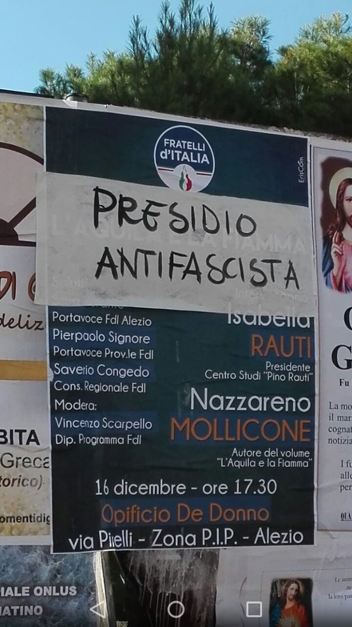 Un fantomatico “presidio antifascista” censura i manifesti di presentazione del libro “L’aquila e la Fiamma”, Congedo: “Intolleranza e inciviltà”