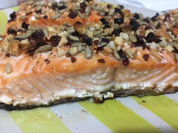 Salmone marinato al forno con crumble di frutta secca