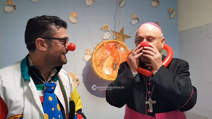 Clownterapia con mons. Vito Angiuli, missione sorriso tra le corsie dell’ospedale Cardinale Panico di Tricase