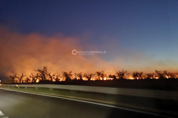 Fiamme dolose nei campi abbandonati a ridosso della statale 101: bruciano decine di ulivi affetti da Xylella