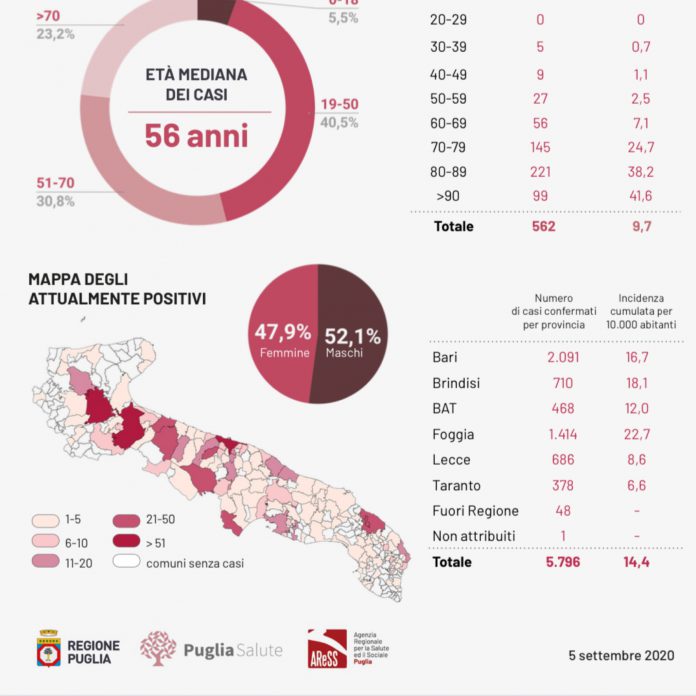 Covid, 55 casi in Puglia: 2 a Lecce. 155 ricoverati. A Seclì sospeso il centro diurno della RSSA