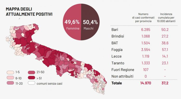 Covid: 424 casi in Puglia, 28 nel Leccese. Aumentano i ricoverati: 648. 8 Comuni con nuovi positivi