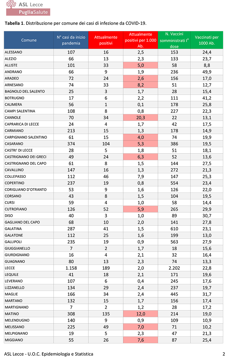 HomePrima PaginaReport covid Asl, ancora critica la situazione a Matino e in diversi...