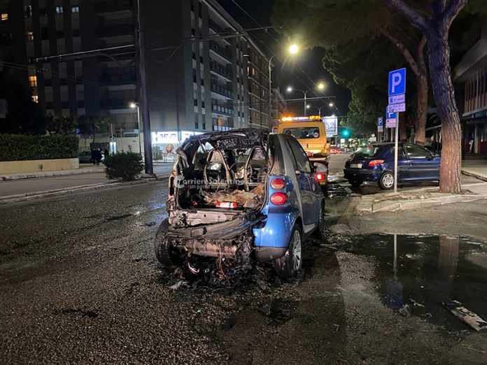Smart prende fuoco in movimento, paura sul viale. A Porto Cesareo rogo distrugge una barca