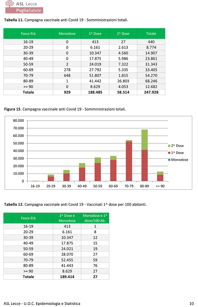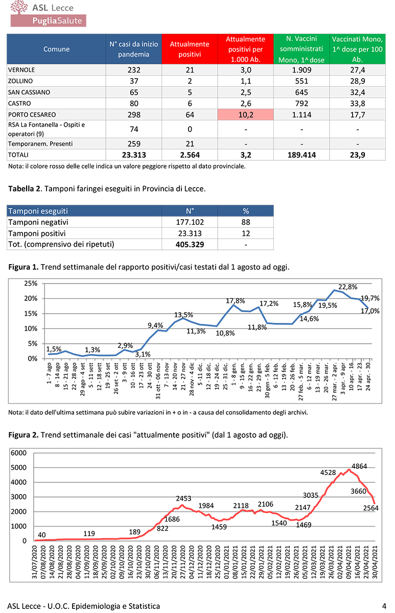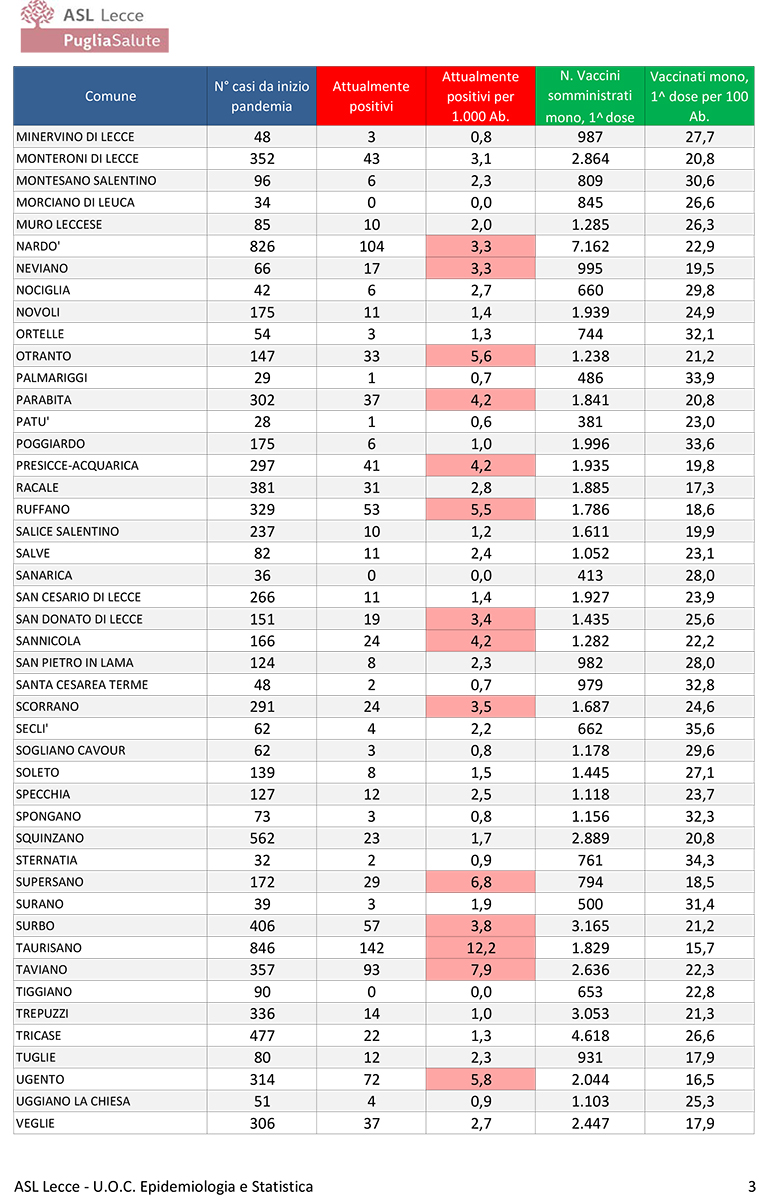 Report covid Asl, scendono a 2564 i residenti positivi. Calo lento a Lecce, aumenti in pochi comuni