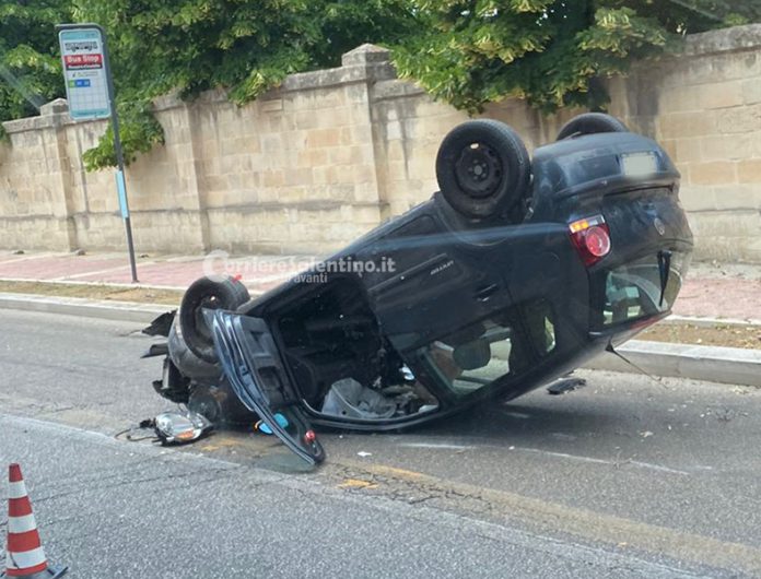 Incidente sul viale: l’auto si ribalta e resta capovolta sull’asfalto. Paura per il conducente