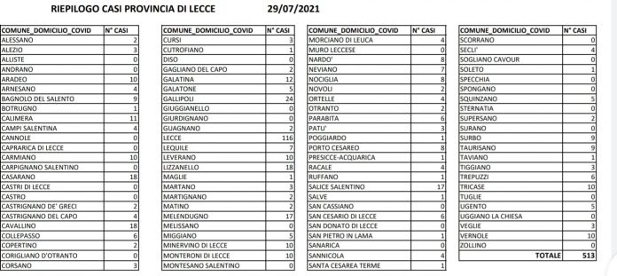 Report SISP Asl, salgono a 513 i positivi in provincia. 116 a Lecce, risale anche Gallipoli. Aumenti in diversi paesi