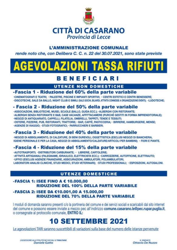 Casarano, arriva l’agevolazione sulla Tari: domande entro il 10 settembre