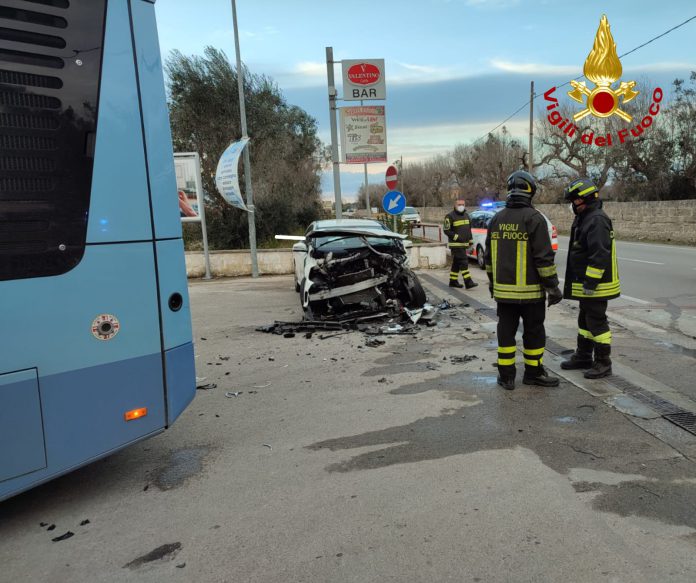 Scontro con un bus di linea all’ingresso dell’area di servizio: 38enne resta incastrato tra le lamiere dell’auto