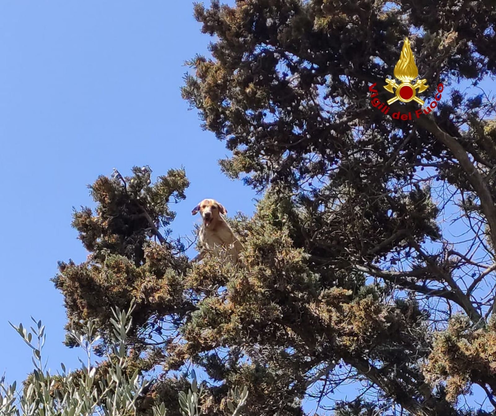 Cane insegue un gatto in cima ad un albero e non riesce più a scendere: tratti in salvo