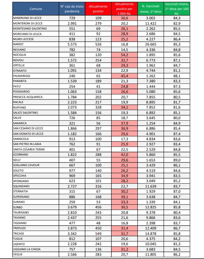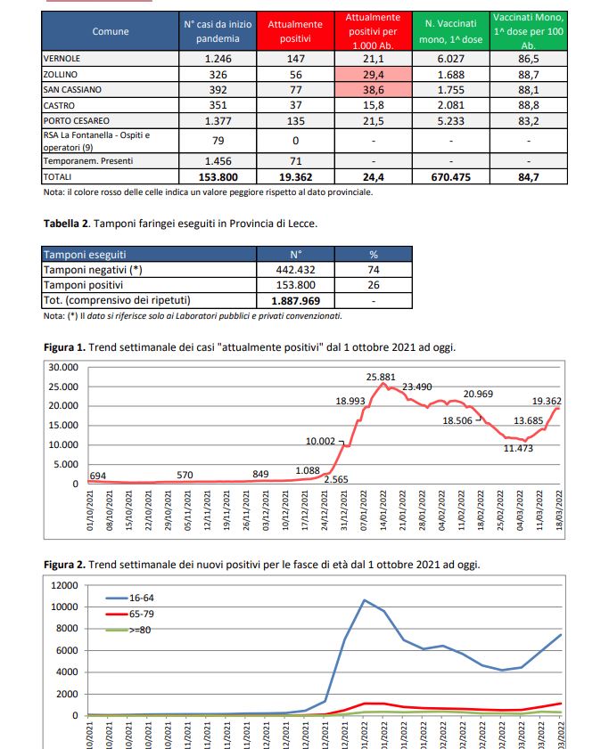 Report covid Asl, salgono a 19.362 gli attualmente positivi: 2.255 a Lecce, 643 a Galatina, 526 a Nardò. Calano i ricoverati: 85 totali e 7 in Rianimazione