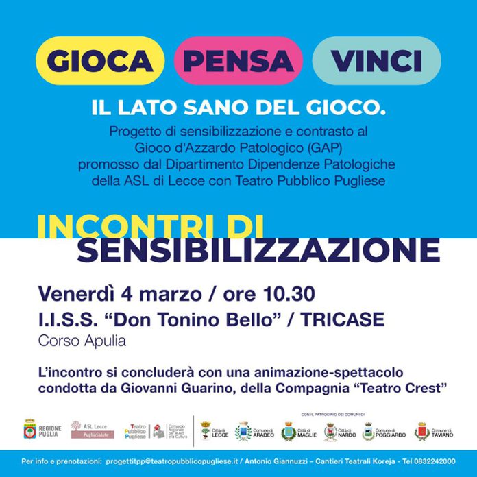 Venerdì 4 “Gioca, pensa, vinci – Il lato sano del gioco” all’I.I.S.S. “Don Tonino Bello” di Tricase incontro di sensibilizzazione sul Gioco d’Azzardo Patologico