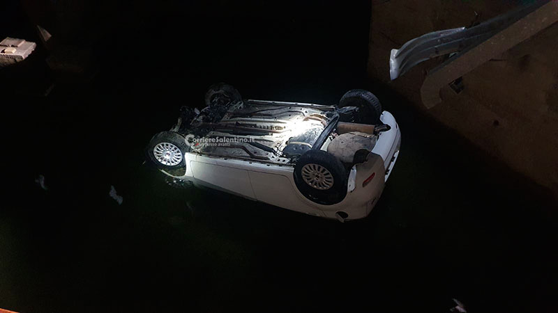 Tragedia sfiorata agli Alimini, auto esce fuori strada e si ribalta nel canale: giovane coppia illesa per miracolo