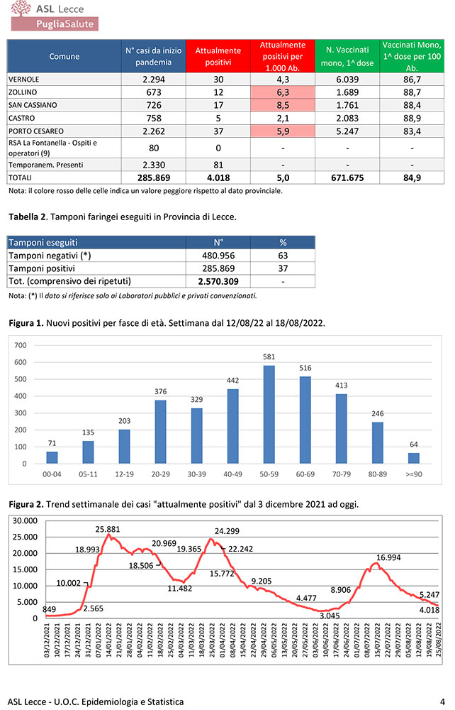 Il report covid Asl conferma che l’ondata estiva è alle spalle. 4.018 attualmente positivi: 371 a Lecce, 159 a Nardò, 131 a Galatina