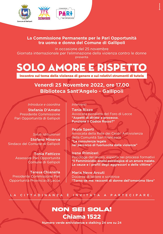 Venerdì 25 novembre “Solo amore e rispetto” evento organizzato dalla Commissione Pari Opportunità di Gallipoli