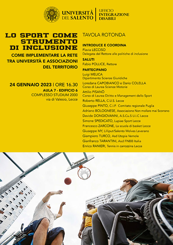 “Lo sport come strumento di inclusione: come implementare la rete tra Università e associazioni del territorio” tavola rotonda a Unisalento il 24 gennaio