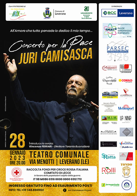 Sabato 28 gennaio concerto per la Pace di Juri Camisasca al Teatro Comunale di Leverano