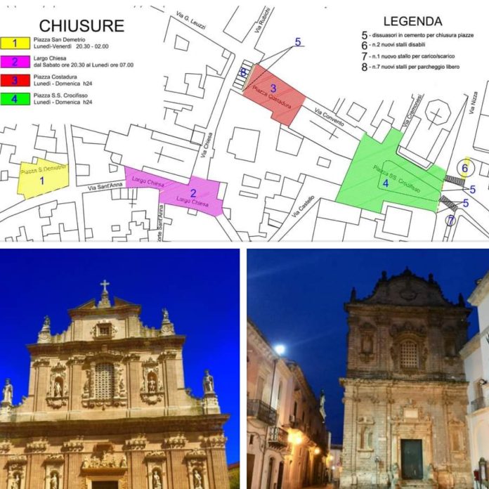 Galatone, nuova regolamentazione nel centro storico: chiusura al traffico veicolare di Piazza Costadura e Piazza Crocifisso