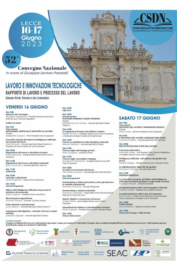 Interazione tra intelligenza artificiale e mondo del lavoro. A Lecce la due giorni del Centro Nazionale Studi di Diritto del Lavoro “Domenico Napoletano”
