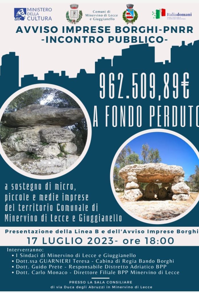 Piano Nazionale Borghi, a Minervino e Giuggianello, finanziamento per le micro, piccole e medie imprese