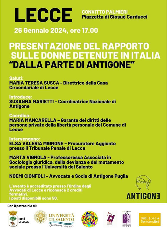 “Dalla parte di Antigone” presentazione del primo rapporto sulle condizioni di detenzione femminile