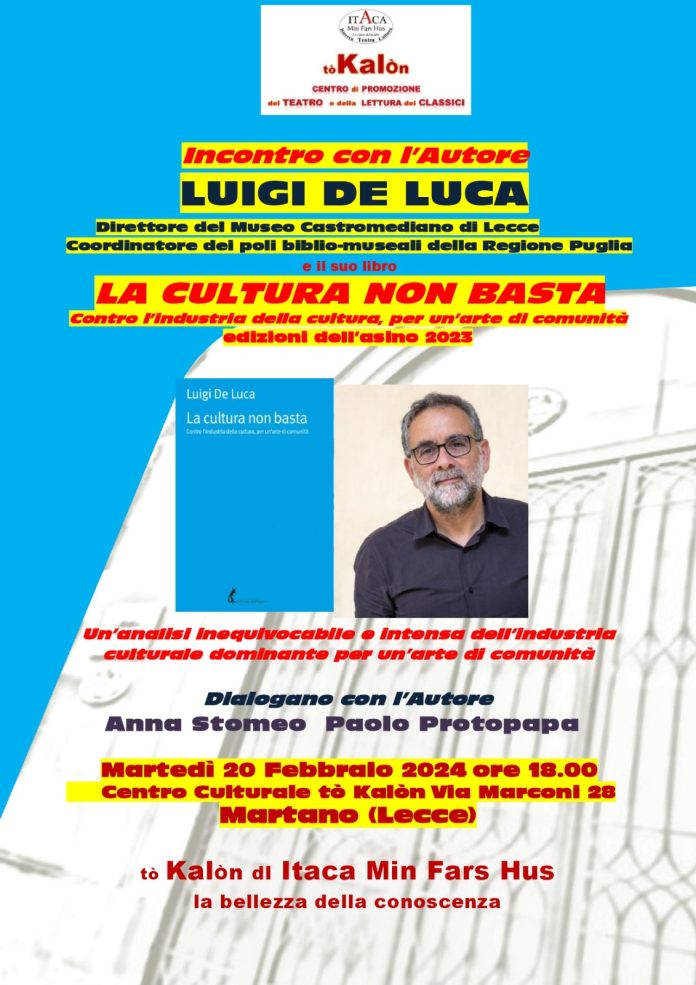 “La cultura non basta. Contro l’industria della cultura, per un’arte di comunità” a Martano la presentazione del libro di Luigi De Luca