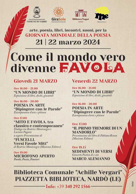 Per la Giornata Mondiale della Poesia “Come il mondo vero divenne favola” il 21 e il 22 marzo a Nardò