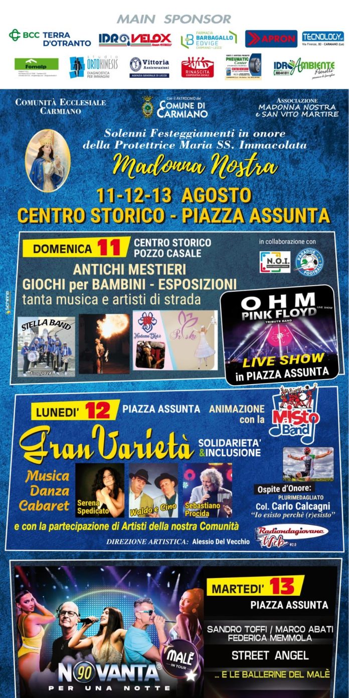 Carmiano, dall’11 al 13 agosto i solenni festeggiamenti in onore della protettrice Maria SS. Immacolata: spettacoli, tradizione e musica