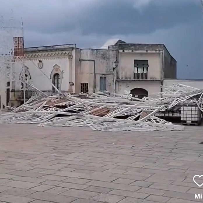 Sanarica, la tromba d’aria distrugge le luminarie. Il sindaco: “C’è amarezza per i danni di migliaia di euro, ma la festa della Madonna va avanti”