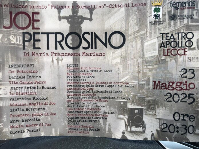 Terza edizione del premio Falcone e Borsellino, in scena all’Apollo il testo teatrale scritto dal giudice Maria Francesca Mariano intitolato “Joe Petrosino“