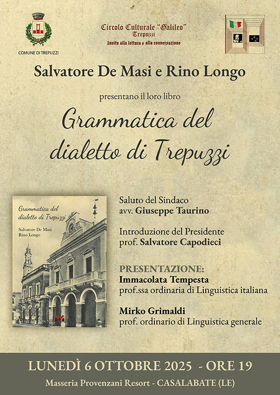 Lunedì 6 ottobre presentazione del libro “Grammatica del dialetto di Trepuzzi” di Salvatore De Masi e Rino Longo