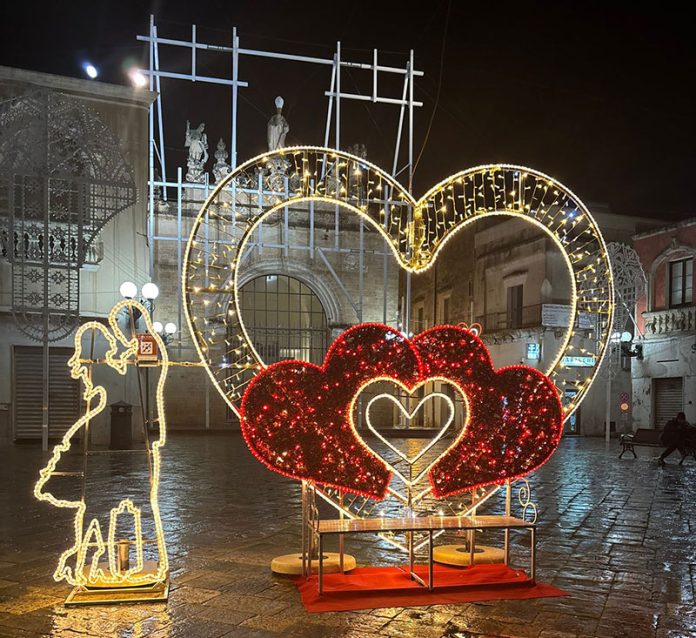 HomeAttualitàInnamorati di Nardò, il centro storico con i cuori illuminati
