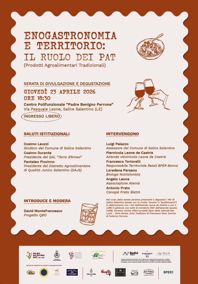“Enogastronomia e territorio: il ruolo dei PAT” – Serata di divulgazione e degustazione a Salice Salentino