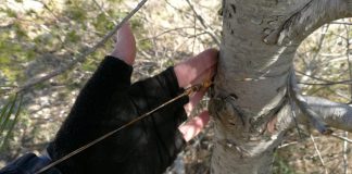 Cavo d’acciaio tra due alberi lungo il sentiero dei ciclisti: caccia...