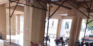 Operai al lavoro sulla facciata del tribunale senza sistemi di protezione,...