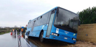 Cede l’asfalto e il pullman carico di studenti finisce fuori strada,...