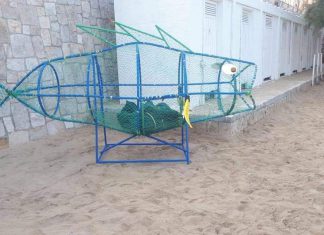 TORRE SPECCHIA (Lecce) - Il grande pesce che raccoglie i rifiuti provenienti dal mare per liberarlo dalla plastica è pronto per essere nuovamente installato...