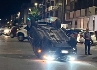 LECCE – Attimi paura ieri a Lecce, dove in un’auto si è ribaltata in seguito all’urto con un’altra auto in sosta.
