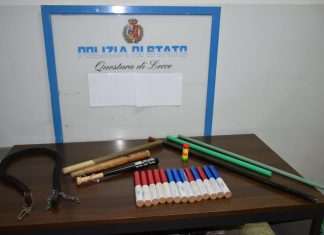 LECCE - Tre bastoni, di cui uno rinforzato con tubo metallico, una mazza da baseball, due tubi in gomma rigida, 14 torce e una...