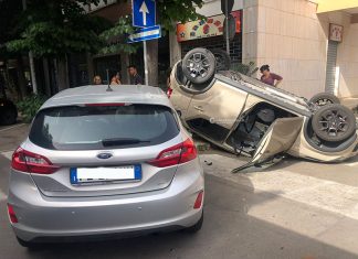 LECCE - Le auto si scontrano all'incrocio e una delle due si ribalta, rimanendo capovolta sull'asfalto.