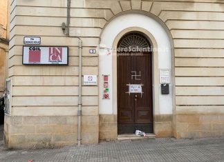 GALATINA (Lecce) - Una svastica sulla porta della sede Cgil di Galatina accompagnata da un cartello affisso all’ingresso con scritto “Violenza e fascismo”.