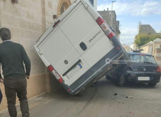 MORCIANO DI LEUCA (Lecce) - Paura nel primo pomeriggio in Sud Salento. Un furgone si è schiantato contro un'auto parcheggiata a Morciano di Leuca,...
