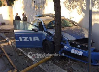 LECCE - Violento scontro tra un’auto della polizia e una Golf e la Volante finisce incastrata tra muro e albero.
