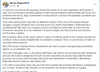 "Lo stillicidio non finisce. Mi vergogno che nel Pd, partito di cui sono segretario, da 20 giorni si parli solo di poltrone e primarie,...