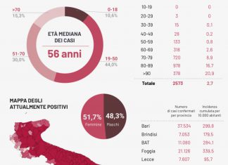 PUGLIA - L’indice di positività, con 10.273 test e con 1081 casi, scende al 10,52% rispetto al 15,25% di ieri, ma il SARS-CoV-2 continua...